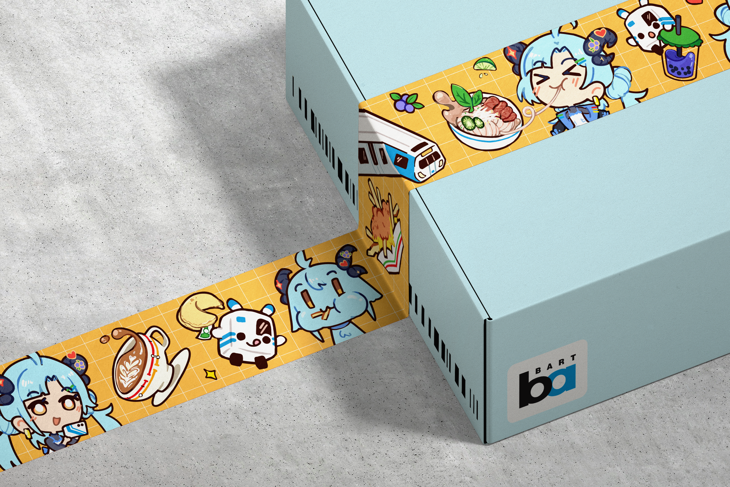 The theme of the design was to show Baylee, the character mascot, enjoying all the different food that the Bay Area had to offer. All of the food depicted is considered a Bay Area staple with dishes that range from snacks to meals to desserts. The tape also contains many elements of the transit system such as depictions of the trains themselves to subtle details that reflect the five different colored train lines.